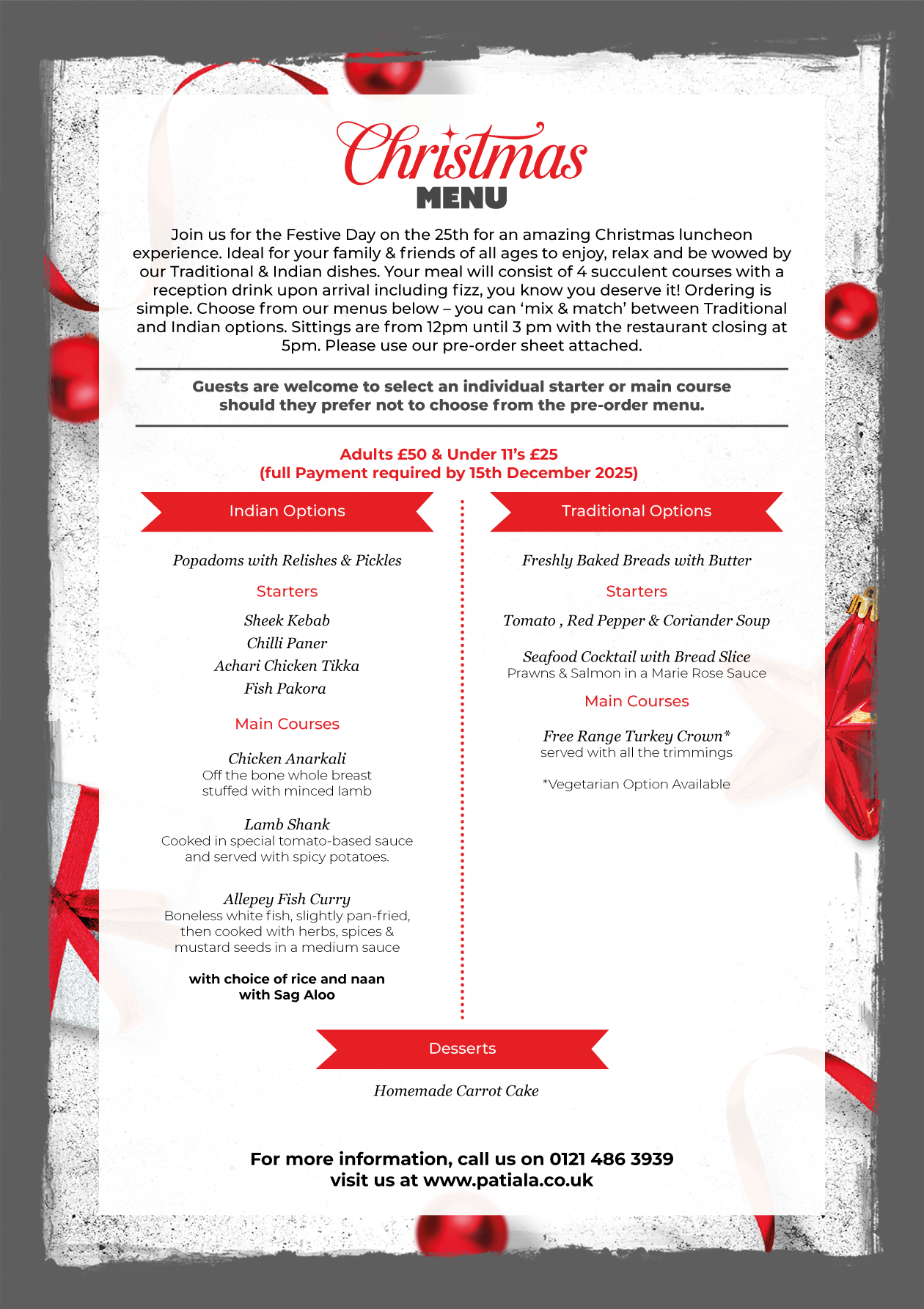 Join us for the Festive Day on the 25th for an amazing Christmas luncheon experience. Ideal for your family & friends of all ages to enjoy, relax and be wowed by our Traditional & Indian dishes. Your meal will consist of 4 succulent courses with a reception drink upon arrival including fizz, you know you deserve it! Ordering is simple. Choose from our menus below – you can ‘mix & match’ between Traditional and Indian options. Sittings are from 12pm until 3 pm with the restaurant closing at 5pm. Please use our pre-order sheet attached.